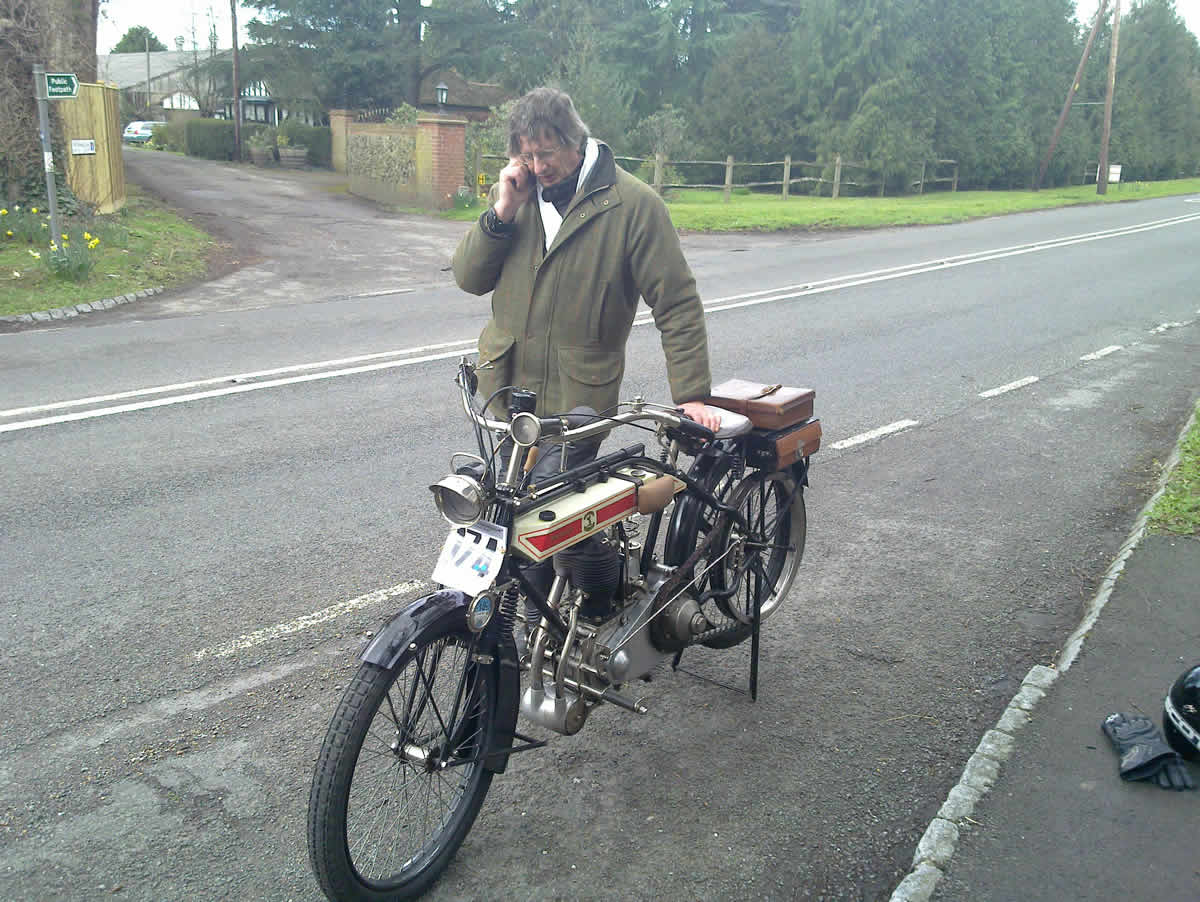 When it’s warm it starts very easily, but as it is only a couple of degrees above freezing so it’s more than the usual pedalling before it fires up – at least it makes me nice and warm as we set off. It’s a lovely time of day to be travelling as the roads are empty, the fields have a coating of mist and the cold damp air is appreciated by the engine. We are heading directly east along the back of the South Downs of Sussex and as we rise and fall over the small hills we get a new sunrise as we crest every hill. Normally I am only up early enough to see a couple of sunrises a year and now I am getting one every few minutes and it adds to the feeling of adventure. The bike is running nicely at about 1,800rpm and we clear the town of Petworth without seeing another car on the road. We continue East along the A272 and then head North on the outskirts of Billingshurst merrily chuffing through more quintessential English countryside. The mist is still hanging a few feet above the fields and I can see Deer in a field half hidden in the mist, they look up as I pass and continue with their breakfast. I can easily imagine my grandfather riding his bikes on roads like this as he set off early to travel 100+ miles to court my grandmother over a century ago.